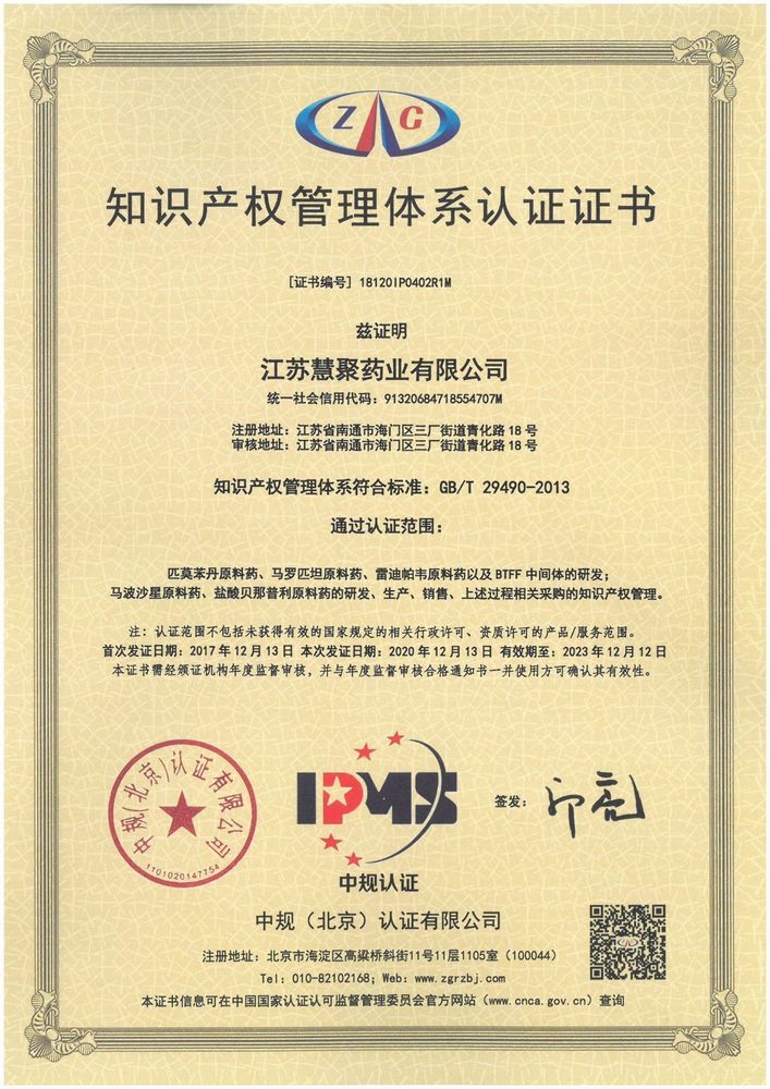 2020年12月3-4日,中规(北京)认证有限公司审核专家组对公司进行为期两天的知识产权管理体系再认证审核,此次再认证审核,专家组对我公司知识产权管理体系运行的适宜性和有效性给予认可和肯定,最终乐鱼(中国)药业顺利通过此次再认证。未来,我公司将继续贯彻《企业知识产权管理规范》,促进知识产权创新发展意识的提高,增强对专利、商标等知识产权的应用和保护能力,将乐鱼(中国)药业打造为知识产权意识强、创新意识强、产业化效益显著和专业人才齐全的创新型企业。