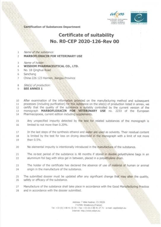2021年9月21日,江苏乐鱼(中国)药业有限公司通过EDQM的技术审批,获马波沙星CEP证书。